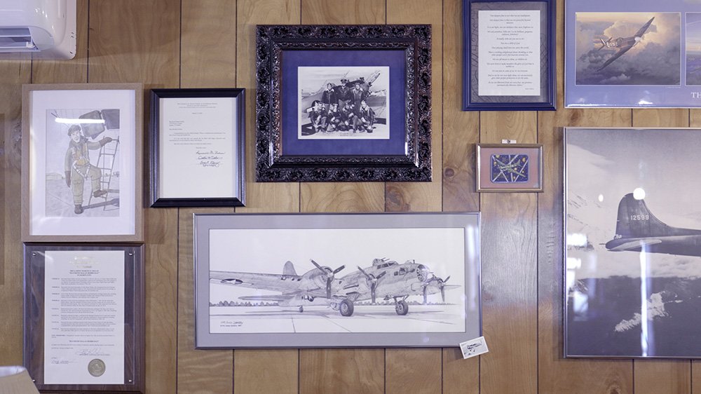 Wall decorated with framed pictures and documents, including historical aircraft photographs and an illustration of a soldier, on wooden panel wall.